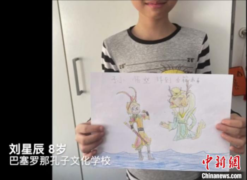 西班牙巴塞罗那孔子文化学校的学生刘星辰展示绘画作品 台州市侨联供图