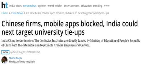 《印度斯坦时报》:中国手机应用程序被禁用,印度下一步可能瞄向大学合作